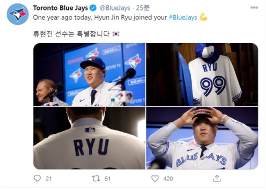 또한 “1년 전 오늘, 류현진은 블루제이스에 합류했다”면서 “류현진 선수는 특별합니다”라고 적어 류현진의 토론토 입단 1주년을 기념했다.