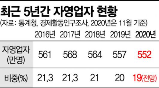 28일 코로나19로 자영업 피해가 이어지며 취업자 대비 자영업자 비중이 사상 처음으로 10%대로 떨어질 전망이다. 통계청에 따르면 올해 1~11월 기준으로 전체 취업자수는 전년 대비 약 18만명 줄었다. 이중 자영업자의 감소 수가 심상치 않다. 7만6000명이 줄어 약 42%에 달한다. 1980년대 30%로 사상 최대치를 기록했던 자영업자 비중은 지난 2017 21.3%까지 줄어들었다. 지난해에는 20%를 기록한 자영업자 비중은 올해 코로나19 사태를 만나 19%까지 줄어들 것으로 예상된다.