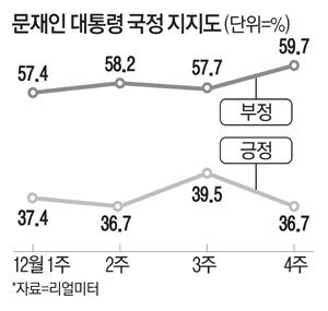 문 대통령에 대한 국정수행 긍정 평가도 전주보다 2.8%포인트 하락한 36.7%로 집계됐다. 이는 현 정부 출범 후 최저치였던 12월 2주 차(36.7%)와 같은 수치다.