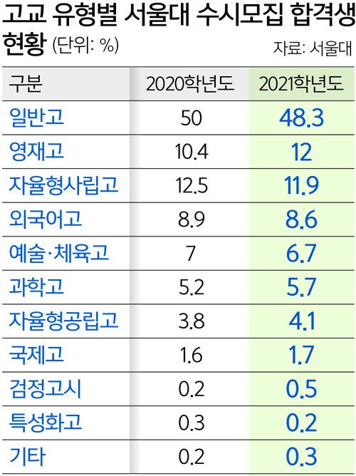 올해 서울대 수시모집 합격자 중 일반계 고등학교 비율이 절반에도 못 미치는 것으로 집계됐다.