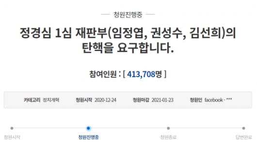 법원이 정 교수를 법정구속한 이튿날인 지난 24일 청와대 국민청원 게시판에는 "정경심 1심 재판부(임정엽·권성수·김선희)의 탄핵을 요구합니다"라는 제목의 청원이 올라왔다. 해당 청원은 29일 오전 7시30분 41만3700여명 이상의 동의를 얻었다.