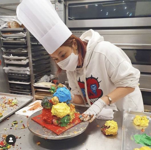 그는 "요즘은 사회적 거리두기로 제빵실에서 케이크 만드는 거에 푹 빠져있어요. 이 케이크도 저만의 방식으로 만들어봤는데 어때요? 너무 실험적인가요?"라고 썼다. 댓글엔 해당 케이크 구매처 태그도 걸어놨다.