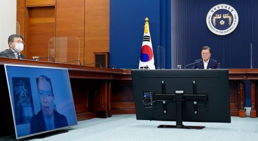 문재인 대통령이 지난 28일 오후 청와대 여민관 영상회의실에서 스테판 반셀 모더나 최고경영자(CEO)와 화상통화를 하고 있다. 청와대 제공=뉴시스 |