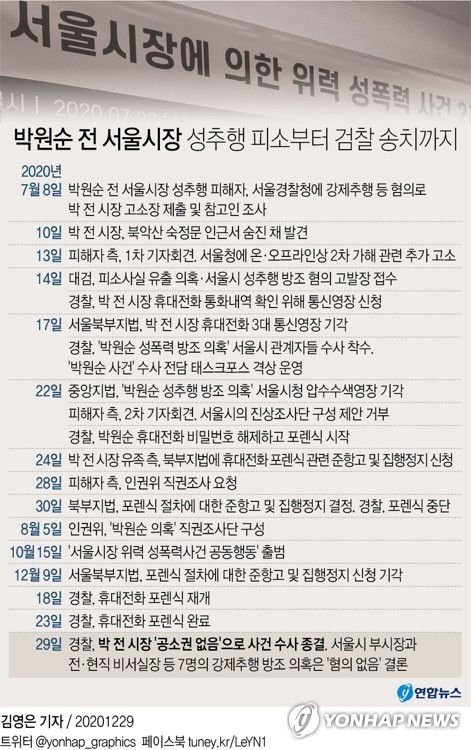 경찰은 "피해자와 참고인을 조사하고 제출 자료를 검토했으나 박 전 시장이 사망한 채 발견돼 관련 법규에 따라 불기소 의견으로 검찰에 송치할 예정"이라고 밝혔다.