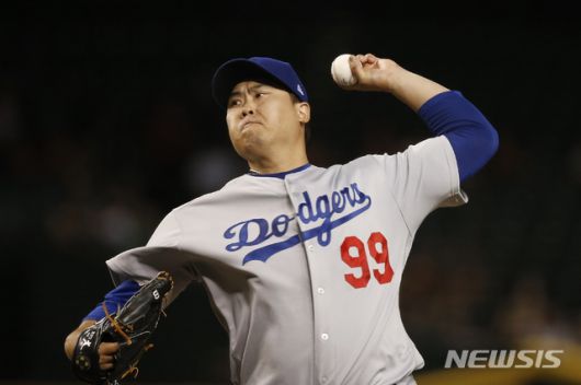 【피닉스=AP/뉴시스】LA 다저스 선발 류현진이 29일(현지시간) 미 애리조나주 피닉스의 체이스필드에서 열리고 있는 2019 메이저리그 애리조나 다이아몬드백스와의 원정 경기에서 1회 투구하고 있다. 13승 사냥에 재도전하는 류현진은 2이닝 3삼진 무실점을 기록하고 있으며 다저스는 3회 초 현재 3-0으로 앞서가고 있다. 2019.08.30. |