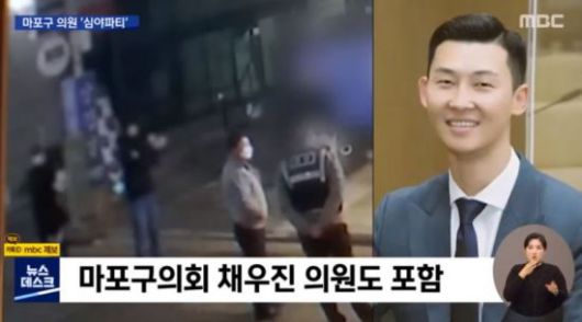 29일 MBC 보도에 따르면 서울 마포구의회 채우진 구의원은 전날(28일) 오후 11시께 파티룸에서 5인 이상 모임을 가지다가 경찰 및 구청 단속팀에 발각됐다. / 사진=MBC 방송 캡처 |