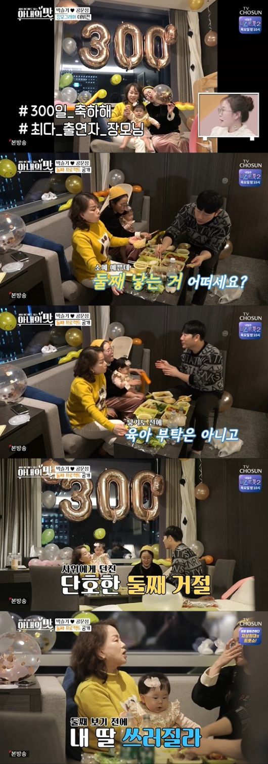 공문성은 박슬기 엄마에게 "소예 이렇게 예쁜데 둘째 낳는 거 어떻게 생각하냐. 둘째 육아를 부탁드리는 건 아니다. 소예 낳고 더 이상은 없다고 하신 말씀이 기억에 난다"라고 밝혔다. 박슬기 엄마는 "슬기가 약해서 걱정이다"라고 걱정했다. 이에 대해 박슬기는 "자연분만 하려고 욕심냈는데 잘 안 됐다. 건강 회복하는 게 쉽지 않았다"라고 출산 당시 힘들었던 순간들을 떠올렸다. 그런데도 박슬기는 둘째에 대한 의지를 드러냈다.