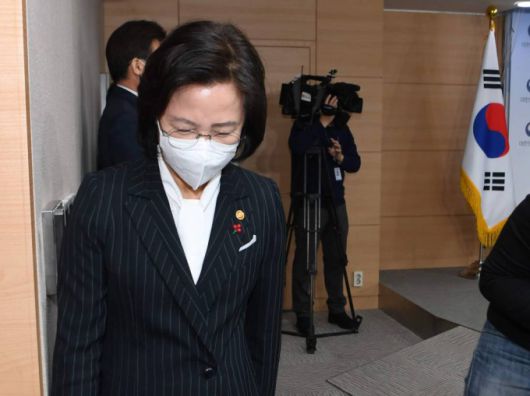 추미애 법무부 장관이 29일 오전 서울 종로구 정부서울청사 브리핑룸에서 2021년 신년 특별사면 발표를 마친 후 브리핑룸을 나서고 있다. / 사진=뉴시스 |