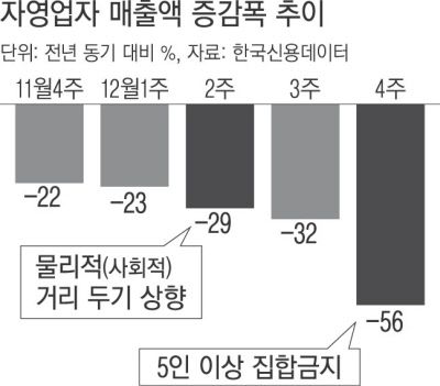 30일 자영업자의 카드 결제 정보를 관리하는 한국신용데이터에 따르면 12월 넷째주(21~27일) 전국 자영업자 매출은 지난해 동기 대비 56% 감소했다. 자영업자 매출은 올 초 코로나19가 발생한 후 지속적으로 감소했지만 절반 이하로 추락한 것은 처음이다.