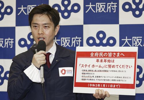(오사카 교도=연합뉴스) 요시무라 히로후미(吉村洋文) 일본 오사카부(大阪府) 지사가 25일 오후 오사카시에서 열린 기자회견에서 신종 코로나바이러스 감염증(코로나19) 확산 억제를 위해 연말연시 회식을 자제해달라는 내용 등이 적힌 패널을 들고 발언하고 있다. |