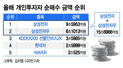 30일 한국거래소에 따르면 개인투자자들은 전날까지 삼성전자를 9조5953억원 순매수했다. 국내 상장기업 중 압도적인 1위다. 2위도 삼성전자 우선주인 삼성전자우(6조1013억원)였다. 두 종목을 합치면 15조6966억원으로 올해 국내투자자 전체 순매수 금액(약 64조원)의 약 4분의 1에 달한다.