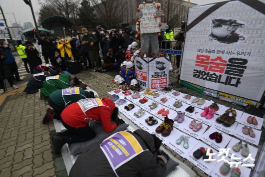 지난 29일 서울 여의도 국회 앞에서 산재 유가족들이 중대재해기업처벌법 제정을 촉구하는 2400배를 준비하고 있다. 박종민 기자 |