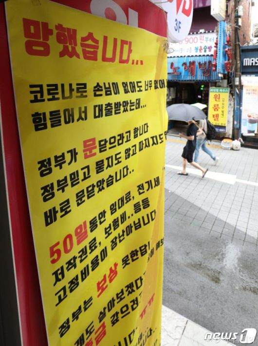(서울=뉴스1) 이동해 기자 = 수도권 사회적 거리두기 2.5단계가 시행 중인 7일 오후 서울 서대문구 신촌 연세로의 한 노래연습장에 폐업 현수막이 걸려있다. 한편, 정부는 59년 만에 한 해 네 번째 추가경정예산(추경)안 편성에 나섰다. 추경 규모는 7조원대며 여기에는 소상공인·자영업자·특수고용형태근로자 등을 위한 현금지원과 함께 고용유지지원금 등 추가적인 맞춤형 민생지원책이 담길 전망이다. 2020.9.6/뉴스1 |