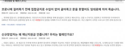특히 최근 열흘 사이 자영업자의 국민청원(50건)이 집중됐다. 지난 21일 정부가 수도권 5인 이상 집합금지를 발표한데 이어 29일 3차 지원금을 지급하겠다는데 대한 불만의 목소리가 높았다.