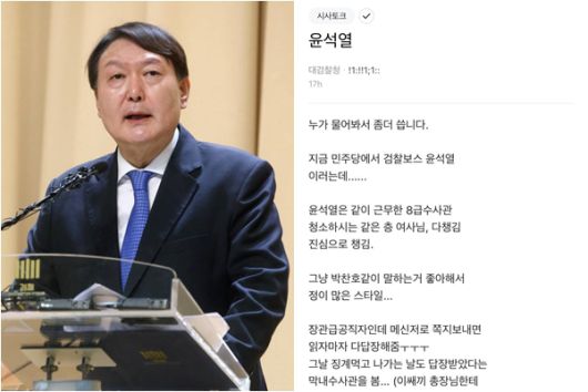 지난 30일 직장인 익명 커뮤니티 블라인드의 대검찰청 게시판에는 ‘윤석열’과 ‘윤석열2’라는 제목의 두 게시글이 올라왔다./사진=머니투데이 DB, 온라인 커뮤니티 캡처 |