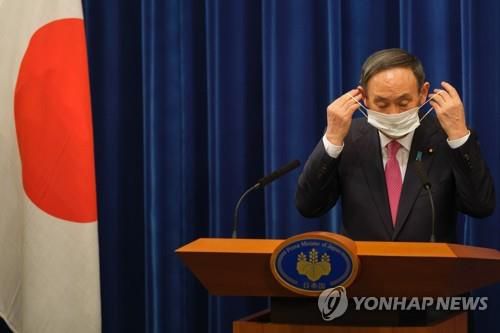 (도쿄 EPA=연합뉴스) 스가 요시히데 일본 총리가 지난 25일 관저에서 코로나19 관련 기자회견을 마친 뒤 마스크를 쓰고 있다. |
