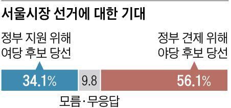 조선일보·TV조선 공동 여론조사에서 4·7 서울시장 보궐선거와 관련한 표심(票心)은 ‘정부 지원’보다 ‘정부 견제’에 쏠려 있는 것으로 나타났다. 칸타코리아가 12월 27~29일 서울 유권자 800명을 대상으로 한 조사에서 ‘정부를 견제하기 위해 야당 후보가 당선되는 게 좋다’가 56.1%로 과반수였다. ‘정부에 힘을 보태기 위해 여당 후보가 당선되는 게 좋다’는 34.1%에 머물렀다.