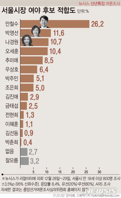 뉴시스가 신축년(辛丑年) 새해를 맞아 여론조사 기관 리얼미터에 의뢰해 지난달 28~29일 서울시 거주 만 18세 이상 남녀 800명을 대상으로 '서울시 정치현안 여론조사'를 실시한 결과 안철수 대표가 26.2%로 서울시장 여야 후보 적합도에서 가장 앞섰다.