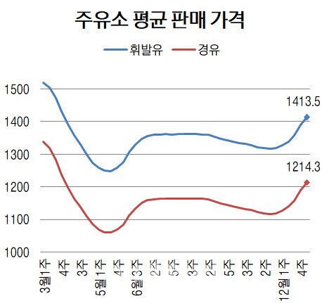지난해 11월부터 1.4원→8.2원→12.2원→18.6원→31.7원 등 확대되던 휘발윳값 상승 폭이 축소했지만 여전히 급등세가 이어졌다. 휘발유 가격이 1400원대를 웃돈 것은 지난해 3월 넷째 주 1430.5원 이후 9달 만이다.