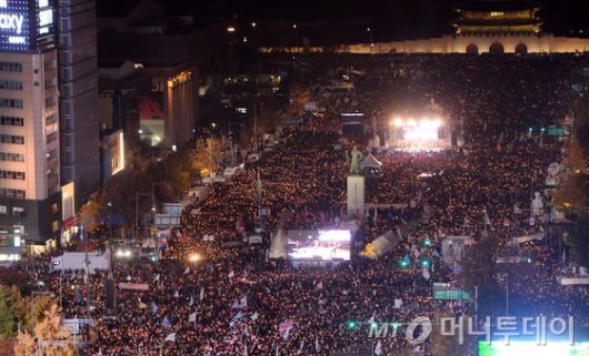 '2016 민중총궐기 대회'인 2016년 11월12일 밤 서울 세종대로에서 시민들이 '박근혜 대통령 하야'를 촉구하는 촛불집회를 진행하고 있다./사진=뉴스1 |