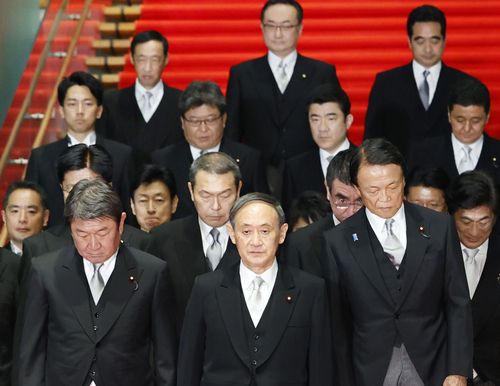 (도쿄 교도=연합뉴스) 2020년 9월 16일 스가 요시히데(菅義偉) 일본 총리 등 내각 구성원들이 일본 총리관저에서 첫 각의를 마치고 기념사진 촬영을 위해 이동하고 있다. |