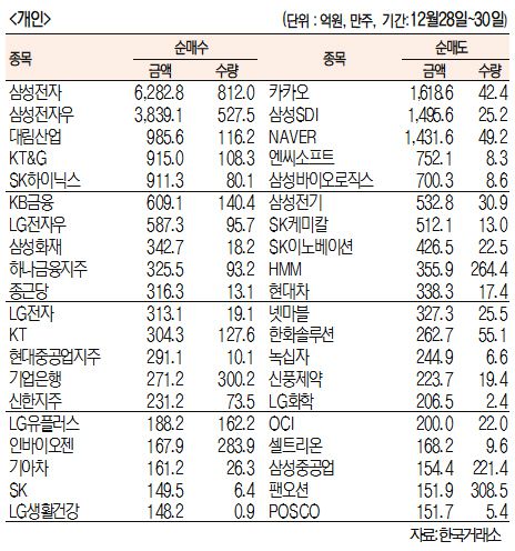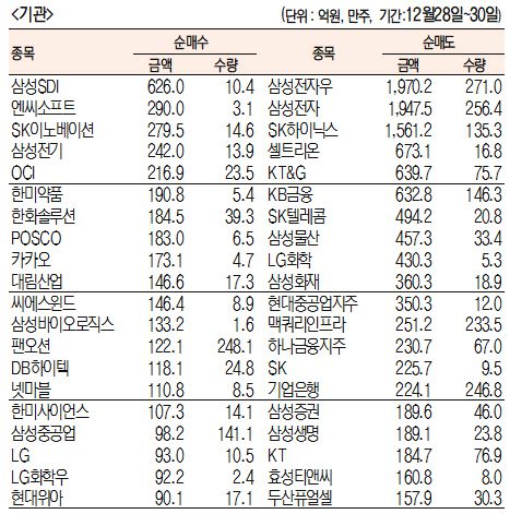[표]주간 유가증권 기관·외국인·개인 순매수·도 상위종목(12월 28~30일)