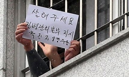 대규모 집단 감염이 발생한 서울 동부구치소에서 233명이 추가 확진돼 누적 확진자가 761명으로 집계된 지난해 12월 29일 서울 송파구 동부구치소에서 한 수용자가 자필로 쓴 글을 취재진에게 보여주고 있다. 뉴시스 |