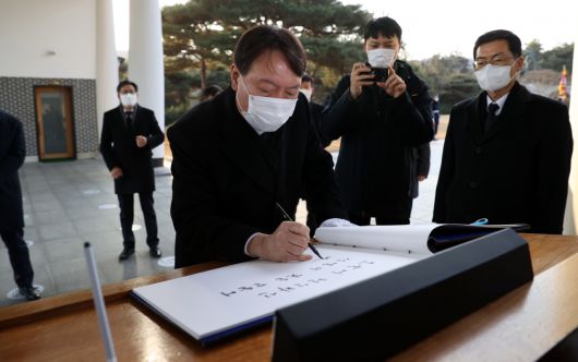 윤 총장은 참배 후 방명록에 "조국에 헌신하신 선열의 뜻을 받들어 바른 검찰을 만들겠습니다"라고 썼다.