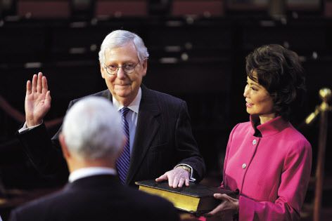 미치 매코널(가운데) 미 공화당 상원 원내대표가 3일(현지시간) 워싱턴DC 의사당에서 상원 의장격인 마이크 펜스(왼쪽) 미 부통령을 앞에 두고 제 117대 미 연방 의회 공식 출범에 앞서 선서를 하고 있다. [EPA] |