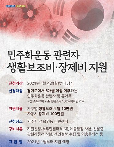 경기도는 이날부터 거주지 읍·면·동 주민센터에서 지원 신청을 받는다. 앞서 도와 도의회는 지난해 5월 민주화운동 관련자 지원을 위해 ‘경기도 민주화운동 관련자 예우 및 지원 조례’를 제정한 바 있다.