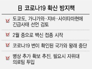 스가 총리가 서둘러 코로나19 대응책을 발표한 것은 코로나19 확산세가 거세기 때문이다. NHK에 따르면 일본의 하루 신규 확진자는 지난해 12월 29일부터 이달 3일까지 엿새 연속 3,000명을 넘었다. 일본에서 코로나19가 확산한 후 확진자가 6일 연속 3,000명 이상을 기록한 것은 이번이 처음이다. 스가 총리는 “확진자가 3,000명을 넘는 등 매우 어려운 상황”이라며 “강력한 조치를 취할 것”이라고 말했다