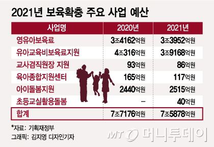 국회를 통과한 2021년 본예산 중 보육확충 주요 사업을 살펴보면 정부가 △영유아보육료 △유아교육비보육료 지원 △교사겸직원장 지원 △육아종합지원센터 △아이돌봄지원 △초등교실활용돌봄 등 2021년 주요 돌봄 예산은 7조5878억원이다.