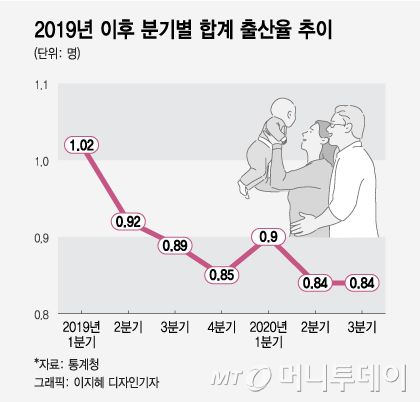 지난해를 포함한 향후 출산율 전망도 어둡다. 지난해 3분기까지 분기별 합계출산율은 △1분기 0.9명 △2분기 0.84명 △3분기 0.84명으로 집계됐다. 3분기 기준으로 1년 전에 비해 0.05명 감소했다. 2019년 4분기 합계출산율이 0.85명이고 0.05~0.12포인트 감소세를 이어온 점 점을 감안하면 지난해 4분기 0.7명대 합계출산율이 나올 가능성도 나온다.