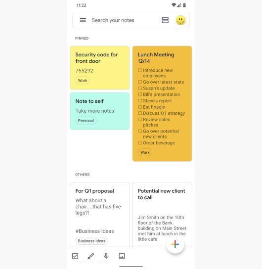 이것이 바로 킵의 장점이다. 앱을 열고, 오른쪽 하단 모서리에 있는 원형 + 아이콘을 탭하거나, 홈 화면에 위젯을 사용해 바로 메모를 할 수 있다. 키보드나 스타일러스, 음성으로 입력이 가능하고, 사진을 찍으면 구글이 텍스트를 추출한다.