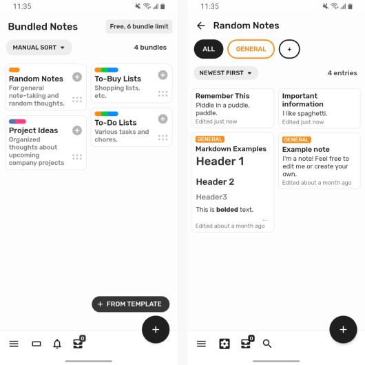 번들 노트(Bundled Notes)는 전도유망한 노트 앱이지만, 아직 공식적인 ‘추천 앱’ 자리를 차지하기에는 아직 완성도가 부족하다. 번들 노트는 한 명의 개발자가 만들고 있어, 구글이나 마이크로소프트 및 기타 기술 거물이 만든 앱보다 훨씬 빠른 속도로 개선되고 있다. 킵의 ‘강화 버전’이라고 생각하면 쉽다. 킵의 기본적인 그리드 스타일의 디자인 및 인터페이스와 유사하지만, 잠재적으로 유용한 도구와 옵션, 맞춤화 가능성이 더욱 크다.