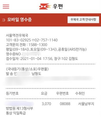 온라인 우체국도 가능합니다. 다만 작성글 내용 하단에 이름, 이미지 파일로 된 서명·도장을 첨부해야 합니다.