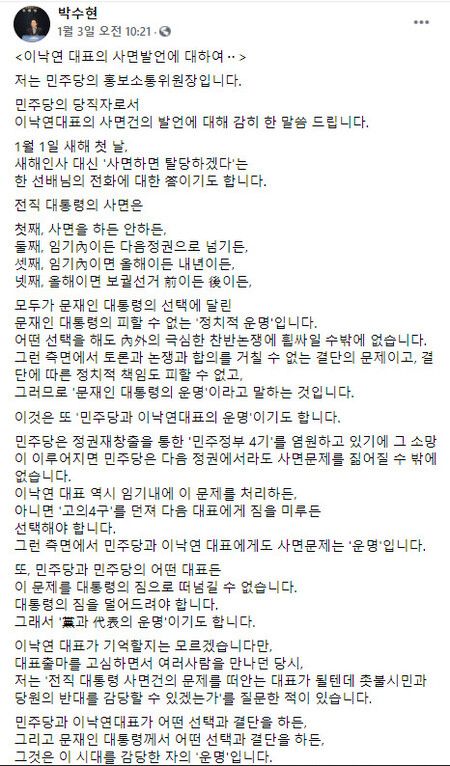 박수현 더불어민주당 홍보소통위원장이 지난 3일 자신의 페이스북에 올린 글. 페이스북 화면 갈무리 |