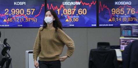 5일 코스피는 전 거래일보다 1.57%(46.12포인트) 2,990.57로 마감해 종가 기준 최고점을 기록했다. 코스닥지수 역시 0.83%(8.14포인트) 오른 985.76으로 마감했다.