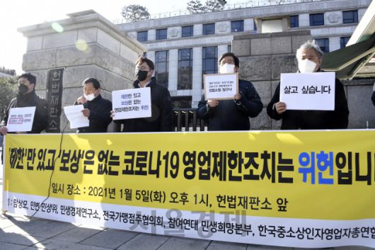 5일 호프집·PC방 등 자영업자들은 참여연대 등 시민단체와 함께 코로나19 확산 방지를 위한 영업제한 조치에 손실보상 규정이 없다며 헌법소원을 제기했다. 이들은 헌법재판소 앞에서 기자회견을 열고 “적절한 손실보상책 없이 제한 사항만 강제하는 등 기본권을 침해받았다”며 서울시 집합제한 조치 고시에 대한 헌법소원심판을 청구했다.
