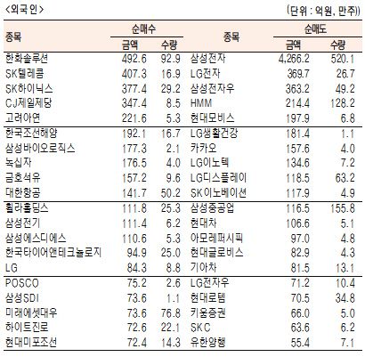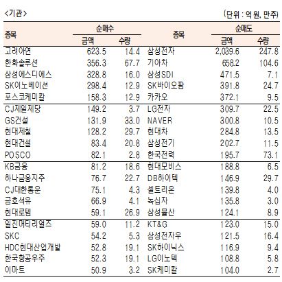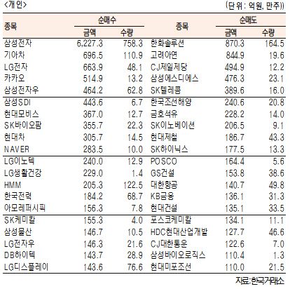 [표]유가증권 기관·외국인·개인 순매수·도 상위종목(1월 5일-최종치)