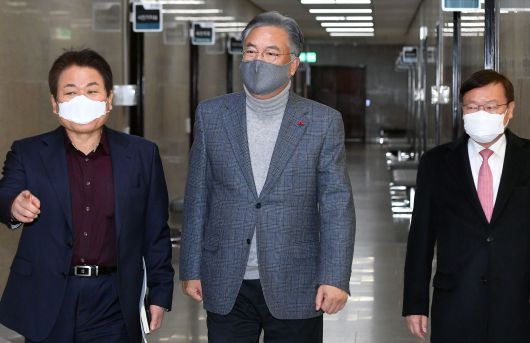 정진석 국민의힘 공천관리위원장이 5일 서울 여의도 국회에서 열린 4·7 재보궐선거 공천관리위원회 2차 회의에 참석하고 있다. 왼쪽부터 정양석 사무총장, 정 위원장, 정점식 당 법률자문위원장. /국회사진기자단 |
