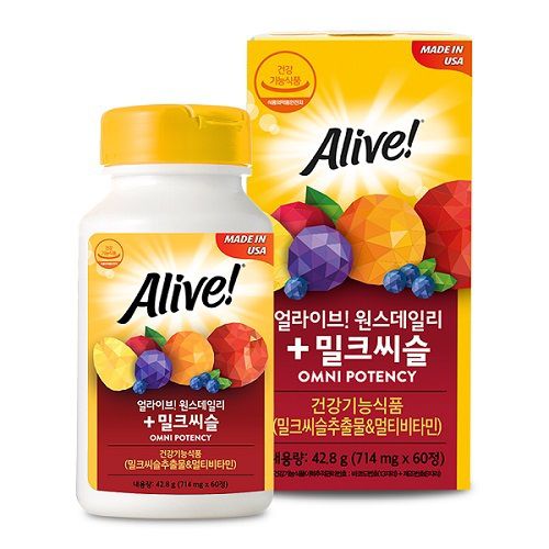 얼라이브 밀크씨슬은 쌩쌩비타민 얼라이브에 밀크씨슬을 더한 제품으로 9가지 주원료 모두 1일 기준치를 충족할 수 있도록 제작된 만큼 하루 한 알로 간 건강을 챙기는데 도움을 줄 수 있다.