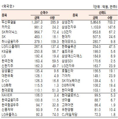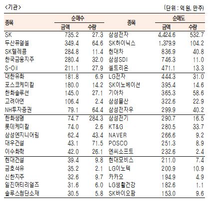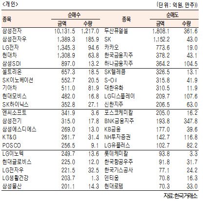 [표]유가증권 기관·외국인·개인 순매수·도 상위종목(1월 6일-최종치)