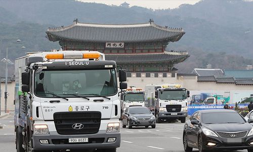 지난해 12월 2일 오전 서울 광화문광장 일대에서 서울시의 분진흡입청소차량이 미세먼지 계절관리제 관련 도로청소 시연을 하고 있다. 연합뉴스 |