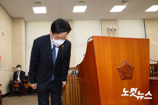 김창룡 경찰청장이 7일 국회에서 열린 행정안전위원회 전체회의에서 생후 16개월만에 양부모의 학대로 숨진 '정인이 사건'에 대해 발언을 마친 뒤 고개숙여 인사하고 있다. 윤창원 기자 |