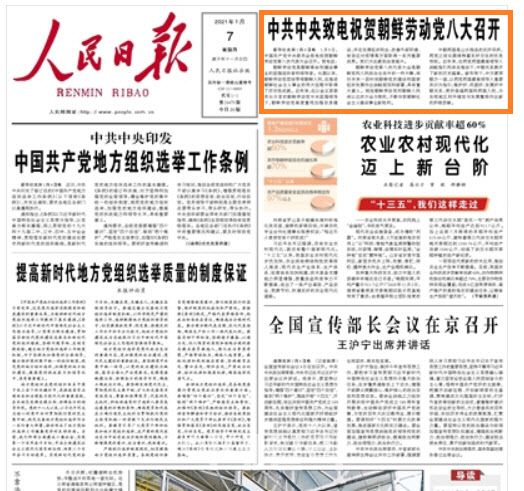 인민일보는 7일자 신문 1면 최상단에 “중국 공산당 중앙위원회가 북한 노동당 제 8차 대회에 축전을 보냈다”는 기사를 배치했다.