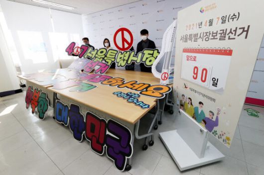 7일 오후 서울 종로구 서울특별시선거관리위원회에서 직원들이 2021년 서울특별시장 보궐선거 D-90 홍보 준비를 하고 있다. 연합뉴스 |