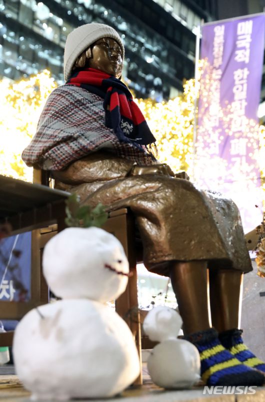[서울=뉴시스]최진석 기자 = 일본군 위안부 피해자들이 일본 정부를 상대로 한국 법원에 낸 손해배상청구 소송 1심에서 승소하며 일본 정부의 배상 책임이 인정된 8일 서울 종로구 옛 일본대사관 앞 소녀상에 눈사람이 놓여져 있다. 2021.01.08. myjs@newsis.com |