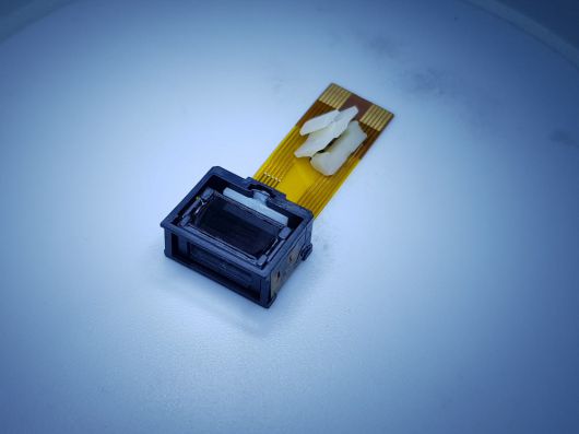 마이크로엑츄에이터가 개발한 폴디드 줌 OIS와 액추에이터 지지구조 부품(연성기판위에 흰색 구조물). |