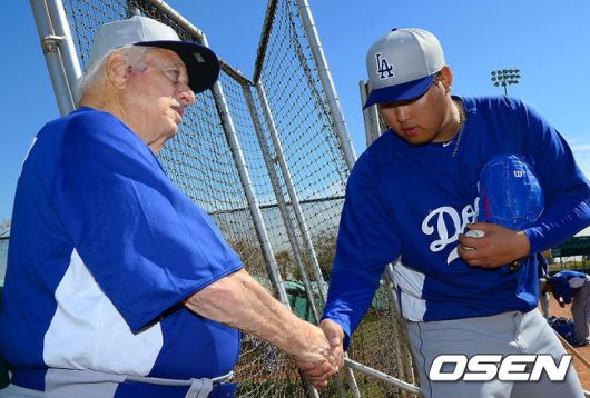 [OSEN=곽영래 기자] 토미 라소다 전 다저스 감독이 2013년 메이저리그 스프링캠프서 라이브 피칭을 마친 류현진과 인사를 하고 있다. /youngrae@osen.co.kr |